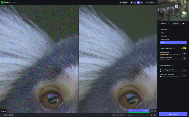 Topaz Denoise AI ne gère pas le bruit comme la majorité des autres logiciels, ils utilisent le derawtiseur pour, dès l’origine, « effacer » le bruit de fond, puis ils vont « derawtiser » votre image afin de la rendre lisible par la plupart des logiciels photo. Leur recette est tirée de millions de tests pour effacer le bruit de luminance et le bruit de couleur.