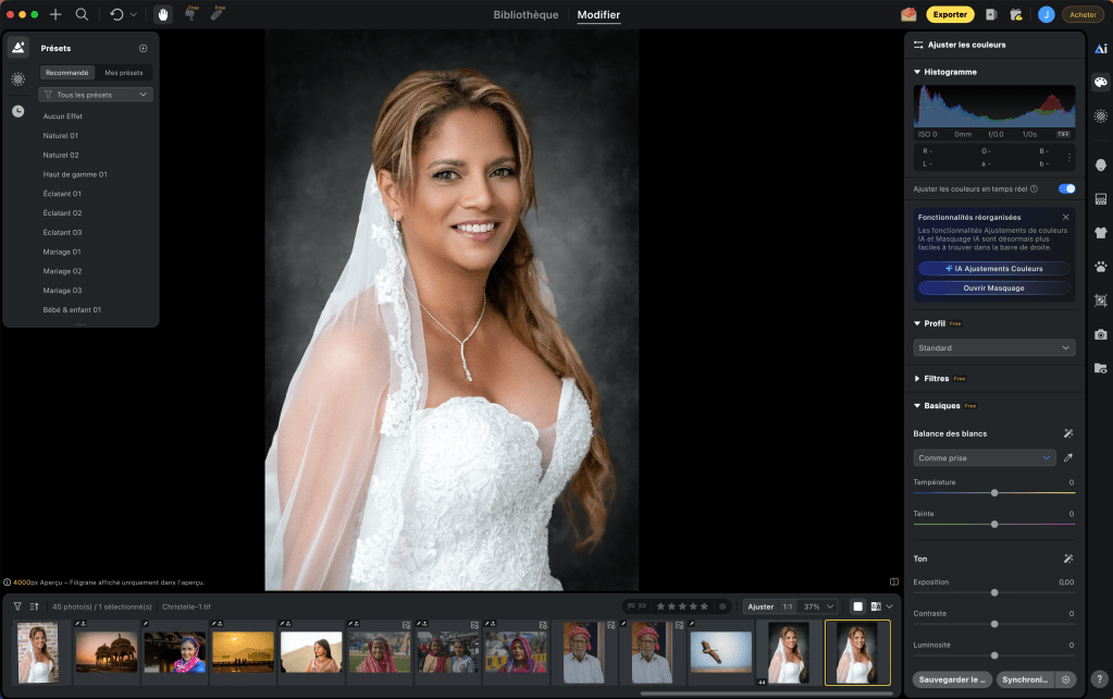 Avant d’aborder l’ensemble des fonctionnalités du logiciel, laissez-moi vous parler des fonctions essentielles à mes yeux : la retouche automatique de la peau, la luminosité des yeux, le blanchiment des dents, permettent à eux seuls de métamorphoser un portrait. Il est vrai que d’autres logiciels proposent ces mêmes fonctionnalités, mais pas avec autant de simplicité, de rapidité et d’efficacité. Ajoutons à celles-ci le nettoyage de l’arrière-plan ou son remplacement, le remplacement de ciel, le nettoyage automatique des vêtements – les photographes de mariage qui doivent supprimer manuellement des dizaines de pellicules sur un costume noir savent ce que cela implique. Ici, il suffit d’un seul clic pour rendre au costume tout son lustre. Enfin je terminerai par deux autres fonctions très utiles, le « défroissage » des vêtements et la suppression des reflets sur les lunettes. À chaque fois, un clic suffit. Quel gain de temps, et je n’ai pas parlé des presets. Vous pouvez retoucher des images individuellement ou importer des « looks de couleur IA », ces presets qui vont donner du caractère à vos images.