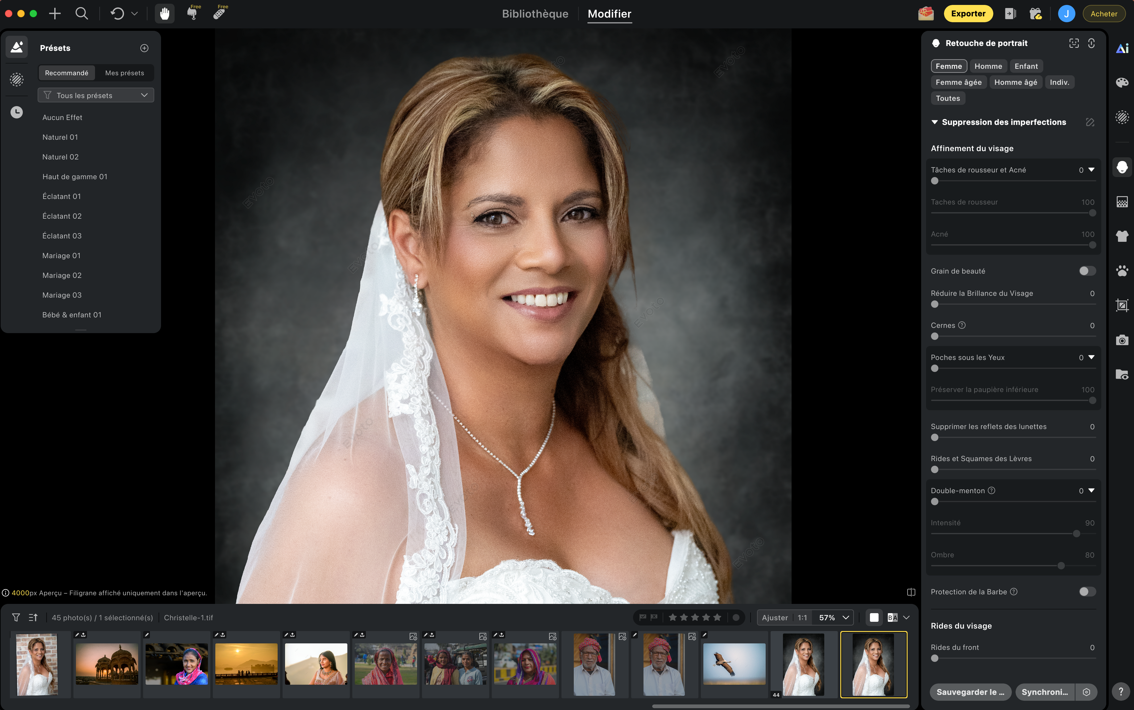 Avant d’aborder l’ensemble des fonctionnalités du logiciel, laissez-moi vous parler des fonctions essentielles à mes yeux : la retouche automatique de la peau, la luminosité des yeux, le blanchiment des dents, permettent à eux seuls de métamorphoser un portrait. Il est vrai que d’autres logiciels proposent ces mêmes fonctionnalités, mais pas avec autant de simplicité, de rapidité et d’efficacité. Ajoutons à celles-ci le nettoyage de l’arrière-plan ou son remplacement, le remplacement de ciel, le nettoyage automatique des vêtements – les photographes de mariage qui doivent supprimer manuellement des dizaines de pellicules sur un costume noir savent ce que cela implique. Ici, il suffit d’un seul clic pour rendre au costume tout son lustre. Enfin je terminerai par deux autres fonctions très utiles, le « défroissage » des vêtements et la suppression des reflets sur les lunettes. À chaque fois, un clic suffit. Quel gain de temps, et je n’ai pas parlé des presets. Vous pouvez retoucher des images individuellement ou importer des « looks de couleur IA », ces presets qui vont donner du caractère à vos images.